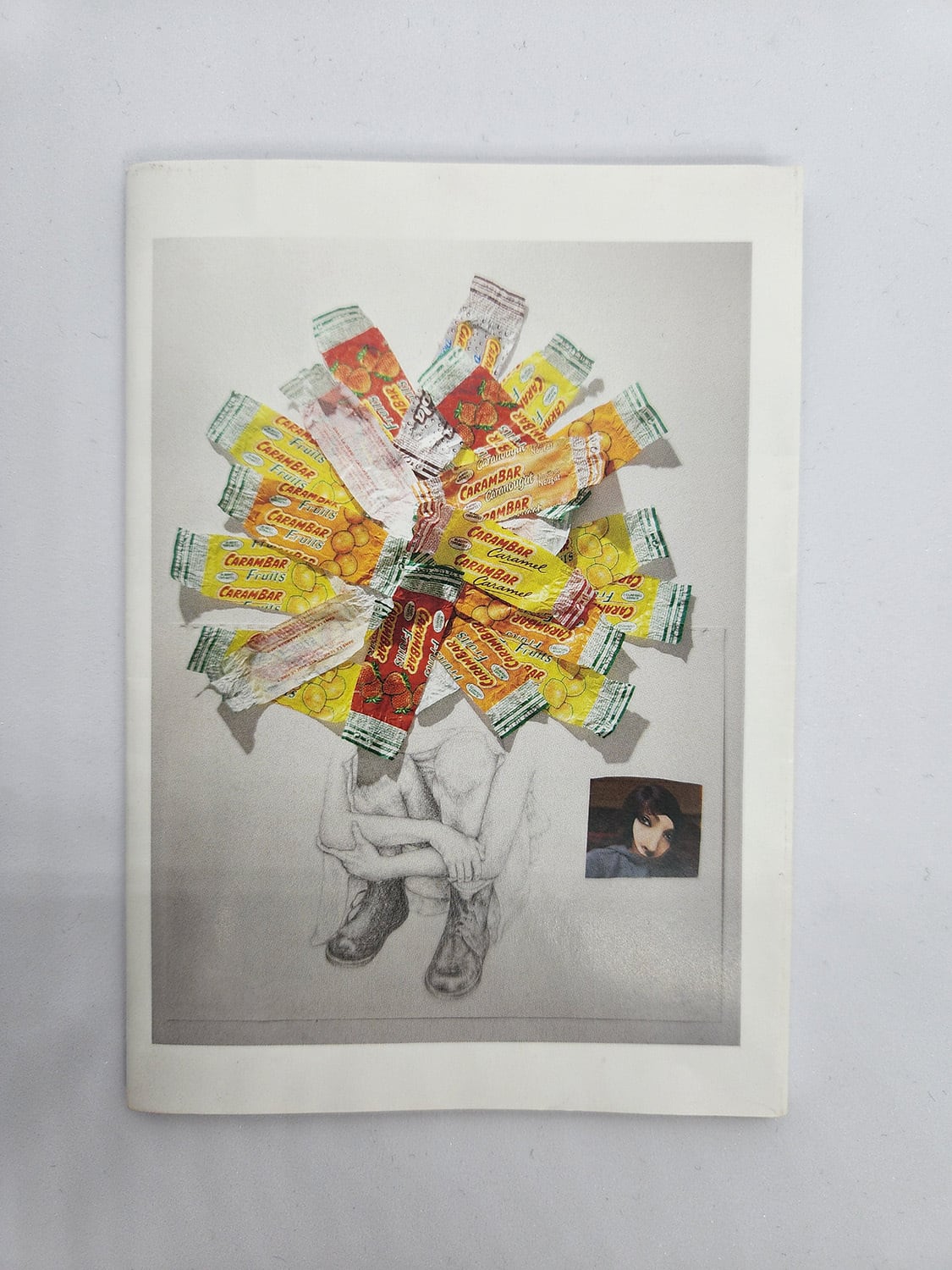 展覧会「Works on paper in Summer」「Works on paper in Autumn」での展示作品を掲載したセサミスペースのZINE。キャラメルの包装紙やお菓子のパッケージと、鉛筆ドローイング、マガジンの切り抜き、ポスター、ペインティングをコラージュ。折本にして裏面はポスターに。ミニステッカー付き。